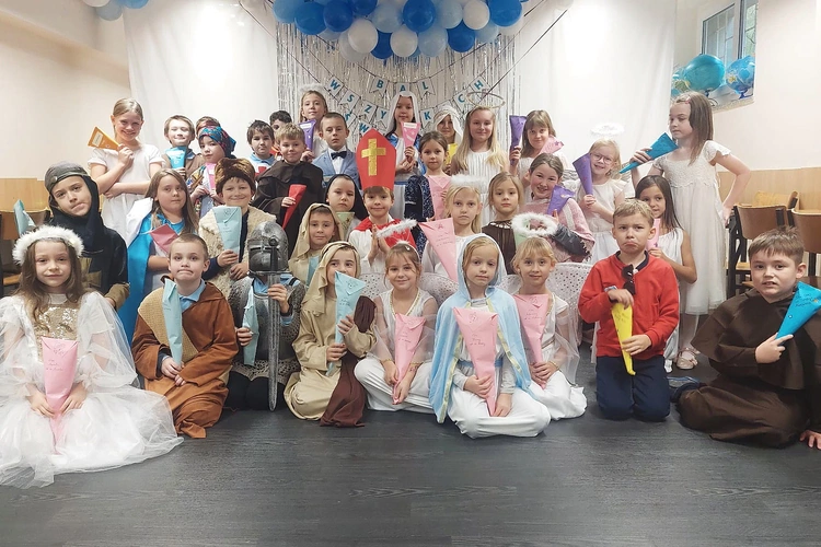 Maluchy przebrały się za postacie świętych i anioły – nie zabrakło św. Franciszka, św. Mikołaja, bł. Carla Acutisa, św. Hiacynty, św. Zuzanny i wielu innych. Nie zabrakło też energii do zabaw przy muzyce i konkursach. W klasach odbyły się niebiańskie uczty w trakcie których każde dziecko otrzymało rożek ze słodkościami, co ważne – dedykowany imiennie, np. „Dla Ani od świętej Anny”.