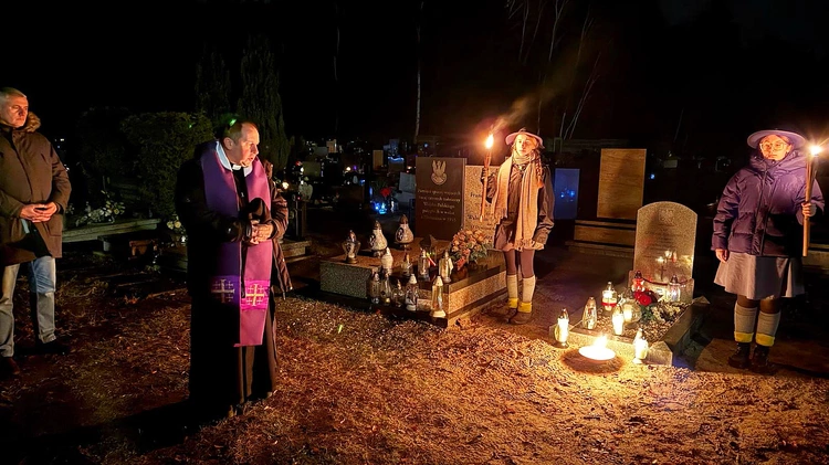 Druga część uroczystości, którym przewodniczył proboszcz parafii ks. Paweł Raczyński MS, odbyła się na cmentarzu komunalnym - poświęcono nowe miejsce pochówku i nowy nagrobek. W wydarzeniu wzięło udział kilkadziesiąt osób, w tym przedstawiciele władz państwowych i samorządowych, stowarzyszenie Pilskich Patriotów. Wartę honorową z pochodniami przy nowym miejscu pochówku pełniły harcerki z ZHR.